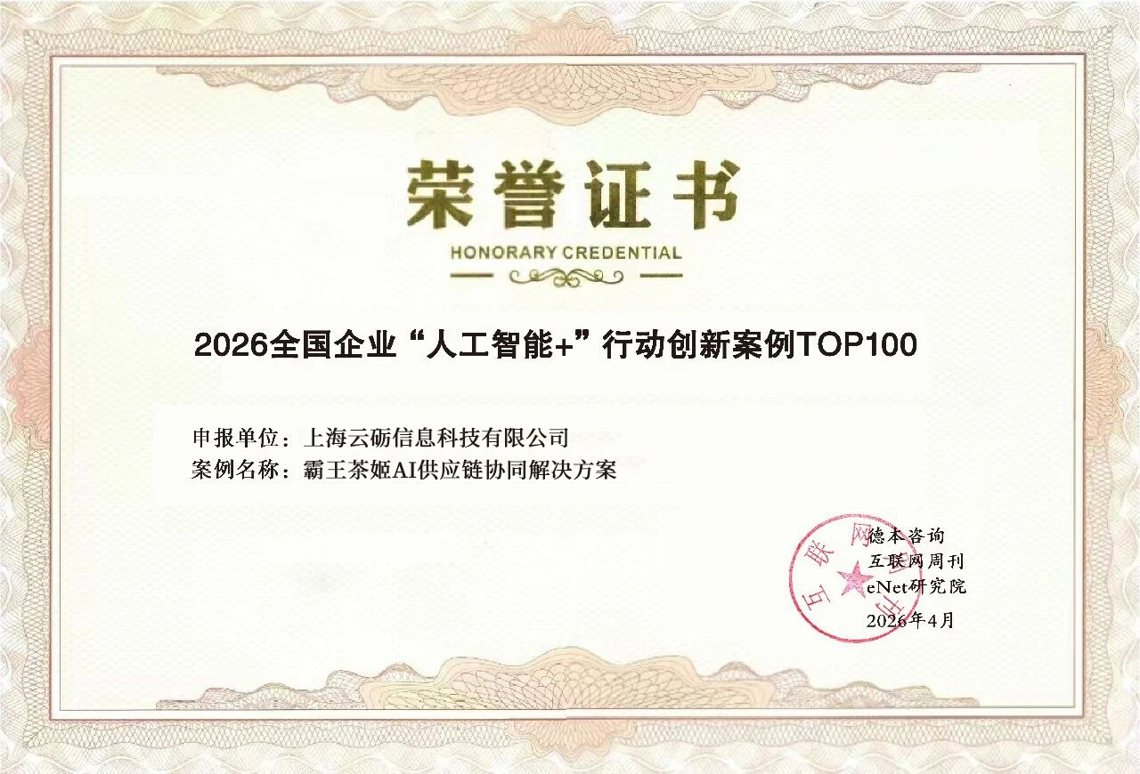 近日,由中国社会科学院主管的《互联网周刊》、德本咨询、eNet 研究院联合主办的《2026全国企业“人工智能+”行动创新案例TOP100》评选结果揭晓。企业协同云砺凭借“霸王茶姬AI供应链协同解决方案”成功入选,以出众的AI创新能力及应用实效再次赢得业界高度认可。